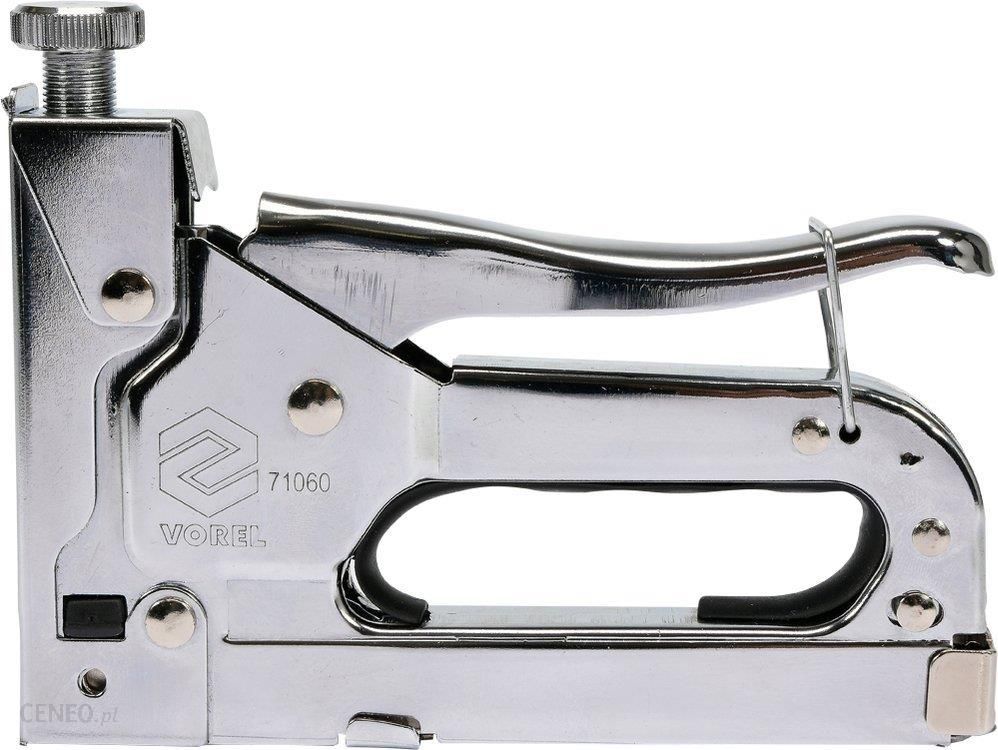 Zszywacz tapicerski marki Vorel 71060. Zszywacz tapicerski przeznaczony do szybkiego łączenia różnych materiałów np. drewna z tkaninami, kartonem, papierem lub skórą. Wykorzystywany w pracach tapicerskich, dekarskich, dekoratorskich, wykończeniach budowlanych itp. Łączy materiały za pomocą wbijanej z dużą siłą stalowej zszywki lub gwoździa. Zszywacz przeznaczony jest do wbijania typowych stalowych, prostokątnych zszywek w zakresie długości od 4-14mm, oraz zszywek zaokrąglonych w rozmiarach od 10-12 mm przeznaczonych do mocowania przewodów elektrycznych. Dodatkową przydatną funkcją jest możliwość wbijania specjalnych gwoździ o długości od 10 do 14mm. Zszywacz z regulacją docisku sprężyny bijaka – regulowana siła uderzenia. Zestaw zawiera 200 sztuk zszywek prostokątnych 8 mm, 200 sztuk zszywek półokrągłych 12 mm, oraz 200 sztuk gwoździ 10 mm.